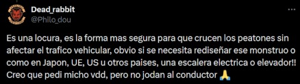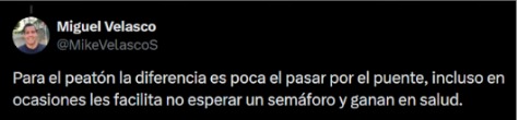 Esta opinión casi nunca viene de personas usuarias de estos puentes y generalmente viene desde el imaginario colectivo que converge y nos hace creer que en la ciudad la prioridad es el automóvil. Porque cualquier persona que tenga que usar algún puente peatonal de manera cotidiana termina odiándolos. Desde una observación sencilla y cotidiana, se puede ver cómo el atravesar una calle de 11 metros, por ejemplo, se convierte en un traslado de 103 metros cuesta arriba. Al ver el tiempo y el esfuerzo extra que implica; con claridad se puede ver que esa infraestructura no es para cuidar su vida, sino que es para evitar que los autos se detengan en un cruce.