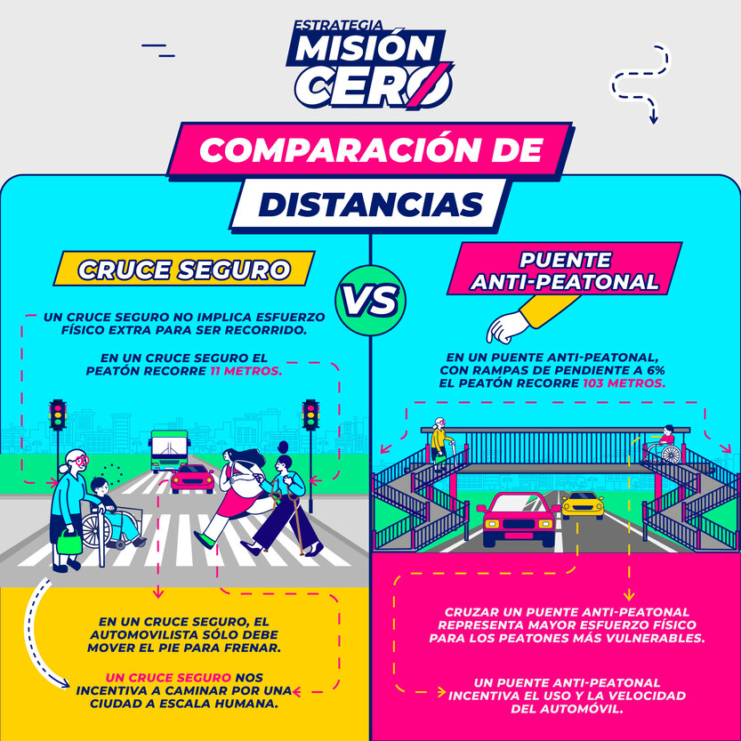 - La Ley General de Movilidad y Seguridad Vial prohíbe tratar a los puentes peatonales como soluciones equivalentes a cruces peatonales —estos deben ser prioridad a nivel de calle—.