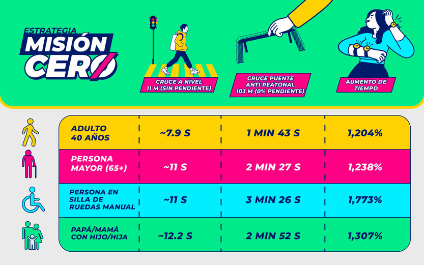 ¿A poco si? ¡En efecto! A continuación calculamos las diferencias en tiempos al cruzar a nivel de piso versus cruzar por puente (anti)peatonal para diferentes tipos de personas usuarias: