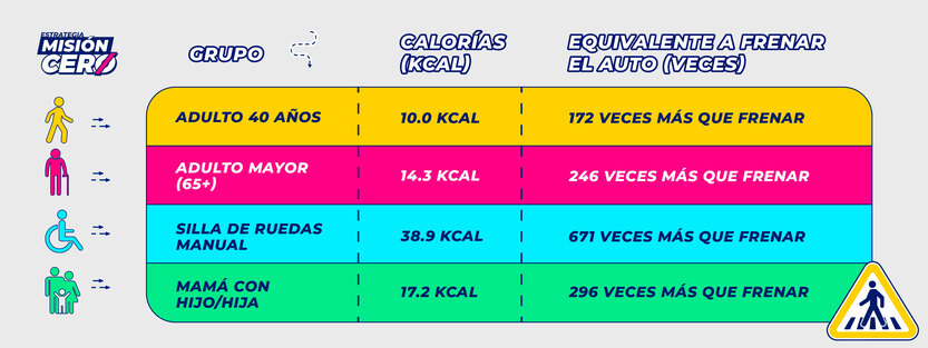 Bueno… sí se tardan más pero vale la pena el tiempo para cruzar de manera segura. ¡No es sólo el tiempo! También es mucho más esfuerzo, a continuación estimaremos el esfuerzo físico en calorías para cada grupo al recorrer 103 metros con una pendiente del 6% y lo compararemos con el esfuerzo físico que implica para una persona en automóvil frenar en un semáforo que permitiría a las personas cruzar a nivel: